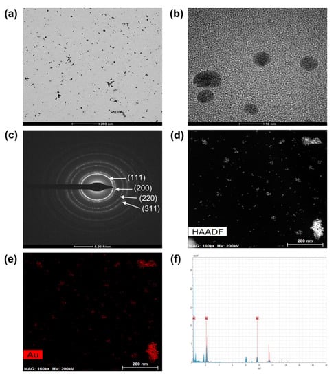 HR-TEM images (a,b), SAED pattern (c), HAADF images (d,e) and EDX spectra (f) of SS-AuNPs. 58 k (a), 630 k (b), 115 k (d,e).
