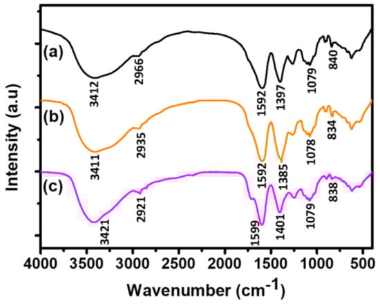 Fourier transform infrared (FT-IR) spectra of (a) SS extract, (b) SS-AgNPs, and (c) SS-AuNPs.