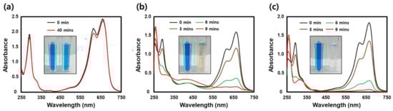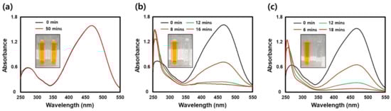 Methylene blue is a heterocyclic aromatic dye utilized in textile and medical treatment fields. It is a good antimalarial agent and remedy against methemoglobinemia []. The maximum UV–vis spectrum peak of MB is present at 662 nm and reduced methylene blue called leucomethylene blue is colorless. The MB in natural water is toxic and the accumulation of MB in the human body can be harmful because of its carcinogenic and mutagenic to living beings []. Figure 7a represents the spectrum of a solution in which sodium borohydride and distilled water was added to methylene blue without a catalyst. After 40 min, the maximum peak was degraded slightly. On the other hand, the maximum peaks were almost degraded and the solutions became colorless both in 9 min as 150 µL of SS-AgNPs (Figure 7b) or 10 µL of SS-AuNPs (Figure 7c) was added instead of distilled water.