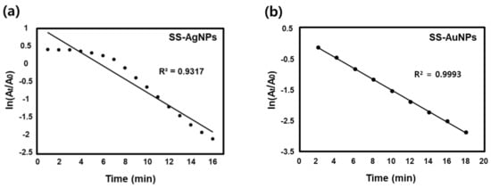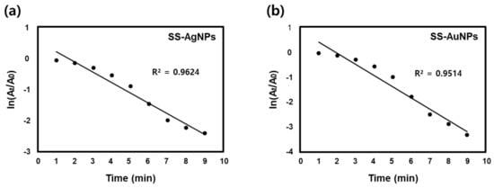 MB was reduced and became colorless leuco form quickly due to the reduction potential and high surface-to-volume ratio of SS-NPs. As the electrons from BH4− ions were transferred to MB by nanocatalyst, the reaction rate was accelerated reducing MB to leucomethylene blue [,]. The calculated reduction rate constants of MB were 0.3299 min−1 (SS-AgNPs) and 0.4473 min−1 (SS-AuNPs) exhibited in Figure 8. Other detailed values are shown in Table 1.