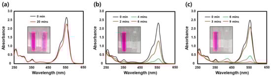Rhodamine B is a water tracer fluorescent dye and has been broadly employed in textile and food industries []. The maximum absorption peak of RB is at 553 nm. RB is degraded to amino compounds as the reduction products []. It has been revealed that RB has carcinogenic and neurotoxic activity []. The absorption measurement of RB with NaBH4 and distilled water is shown in Figure 9a. The surface plasmon resonance (SPR) peak at 553 nm was slightly lowered. However, with the addition of algae-mediated AgNPs (10 µL) and AuNPs (10 µL), the absorption measurement at 553 nm was completely decreased within 6 and 9 min and the solution became colorless, which is shown in Figure 9b,c.