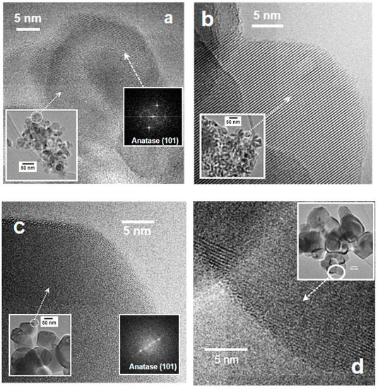 The surface area of nano-sized powders, analyzed by means of the BET method, is higher than that of the larger-sized samples, as expected [14]. P25 and PC105 show a surface area of 50 and 80 m2/g, respectively, while 1077 and AH-R show much lower values (~12 m2/g). The XRD spectra reveal the presence of the pure anatase phase for all the quoted samples but P25, which contains a 75:25 ratio of anatase-to-rutile phase [34]. The morphological aspects of all samples were examined by HR-TEM (Figure 1). Nanometric powders (P25 and PC105) exhibit the typical average particle size of 20–30 nm. Furthermore, the nanosized materials are homogeneous with well-packed crystalline particles. In parallel with this, a distinctive morphology could be noticed in the larger-sized samples (1077 and AH-R). The average crystallite size of the anatase, calculated via Scherrer’s formula, falls into the 100–130 nm range. In all cases, the analyses of the fringe patterns (either as such or by means of the FFT elaboration) reveal the presence of the (101) family of planes ascribable to the anatase phase (ICDD card n. 21-1272).