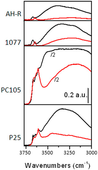 It is well known that surface hydroxyls are crucial species for the photocatalytic process. In particular, photo-generated holes may react with water molecules adsorbed on semiconductor surfaces, resulting in the formation of trapped holes as OH radicals [14]. To show the prospective formation of these radicals, FTIR spectra of the samples in the ν(OH) spectral range in air (black lines) and after outgassing at RT (red lines) are reported in Figure 2. All the materials in air exhibit two complex absorption bands, respectively located in the 3000–3450 cm−1 range and at ν ≥ 3600 cm−1. On the basis of the spectral behavior and of the literature data [35,36], the former broad peak can be ascribed to the stretching mode of all H–bonded OH groups present at the surface of the various solids, whereas the latter corresponds to the stretching mode of all the Ti–OH species free from hydrogen bonding interactions. Comparing the spectra of smaller-sized samples with that of larger-sized TiO2, it is evident that nano-sized samples are characterized by a significantly higher amount of hydroxyl species. In particular, PC105 shows the highest amount of OH groups among the samples studied, where the absorbance of PC105 has been halved. Moreover, nano-sized surface samples are characterized by an uneven distribution of terminal Ti–OH species in comparison with their micro-sized counterparts (1077 and AH-R).