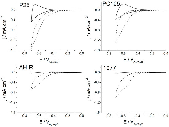 Voltammograms in the dark for nano-sized (P25 and PC105) and sub-micro-sized (1077 and AH-R) electrodes in 0.1 M HClO4 solution in the presence (---) and in the absence (—) of oxygen.