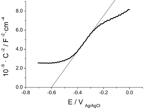 where Csc represents the differential capacitance of the space charge layer. The flat band potential is given by extrapolation to C−2 = 0. Figure 4 shows the M–S plot for the TiO2 electrode AH-R. A good linear correlation is found in a relatively wide potential range. This is interesting as it is compatible with the large particle size of AH-R sample sustaining a space charge layer. The value of Efb results to be around −0.6 V. This behavior is mainly determined for the particle size in the case of particulate electrodes, and it can thus be anticipated for electrodes of this kind.