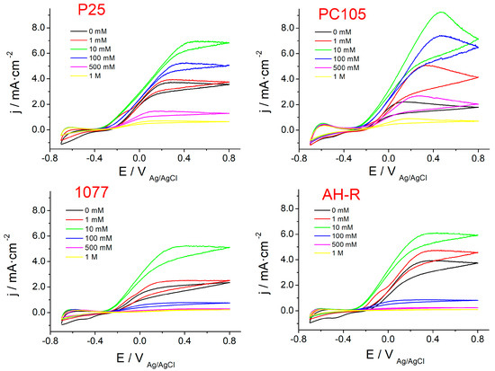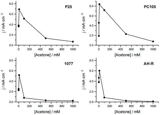 Figure 6 corresponds to the stationary photocurrent density (at 0.6 V) vs. acetone concentration plots for the same electrodes. The oxidation photocurrent increases with the concentration of acetone up to 10 mM and then decreases until a near-negligible photocurrent at 1 M of acetone. The values of the photocurrent under otherwise the same conditions depend on the TiO2 type, but the characteristic trend is similar for all samples. The maximum current recorded using 10 mM acetone for the nano TiO2 samples, P25 and PC105, is in the range of 7–9 mA/cm2, whereas for 1077 and AH-R electrodes the values are slightly lower (5.5–6 mA/cm2). The adsorption of acetone on the surface of the TiO2 film might explain the trend observed for the photocurrent as the acetone concentration in the electrolyte is increased. The addition of acetone (<10 mM) increases the photocurrent because either free or trapped holes react easily with the acetone adsorbed on TiO2 allowing for an enhancement of the oxidative process. However, a further increase of the concentration of acetone gradually decreases the observed photocurrent maybe according to a strong adsorption of the pollutant that diminishes the formation of OH˙. For acetone concentrations higher than 1 M, very low photocurrents can be recorded probably due to a complete inhibition of the anodic process by blocking the TiO2 electrode surface.