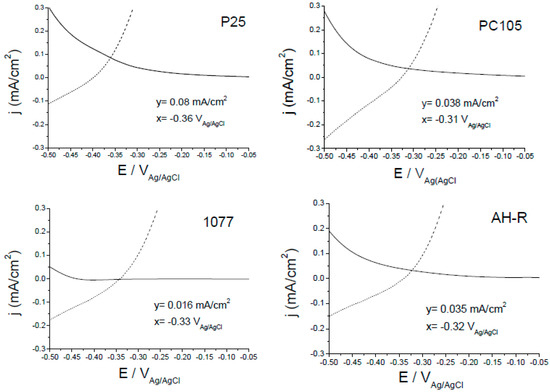 To gain more information about the potential activity of these powders as photo-electrocatalysts, in Figure 7, the current density under illumination for the different TiO2 electrodes corresponding to the photooxidation of acetone (dashed line) together with the current density in the dark corresponding to the reduction of oxygen (solid line) are plotted together. According to the Wagner–Traud principle, the intersection point gives the value of the photocurrent (acetone oxidation) and the dark current (oxygen reduction) under open circuit conditions (i.e., under the typical conditions of suspended photocatalysts). This approach allows us to correlate both photo-electrochemical and photocatalytic measurements, as the latter is a particular case of the former where under open-circuit condition, the rates (or currents) of the anodic and cathodic processes are matched [42]. Figure 7 shows that the P25 powder gives the fastest acetone oxidation of all the samples checked. PC105 and AH-R would have very similar photoactivities, while 1077, would show the lowest photoefficiency. The significant differences found among the different TiO2 powders highlight that P25, thanks to its peculiar properties, like high surface area, the presence of rutile and the particle morphology, happens to show the best photoefficiency. In particular, we believe that P25 efficiency is highly enhanced by the presence of both phases. The offset between the energetic locations of the conduction band and valence band edges for rutile and anatase should favor charge separation and diminish recombination. In general, there are two opposite factors that should play a key role in determining the photoactivity of powdered TiO2 samples and electrodes: (i) a high interfacial area in nanocrystalline samples, which is particularly desirable in the case of substances present at low concentrations; and (ii) the existence of a space charge in microcrystalline samples, diminishing recombination and enhancing photoactivity. Because of the existence of these opposing factors, it is understandable that particular nanocrystalline and microcrystalline samples could exhibit similar photoactivities. Thus, according to our electrochemical measurements, the photoefficiency of the studied TiO2 samples follows the trend: P25 > PC105 ≈ AH-R > 1077.