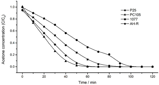 Photocatalytic acetone degradation with smaller-sized (P25 and PC105) and larger-sized (1077 and AH-R) TiO2 samples. Initial acetone concentration (C0) is 400 ppmv.