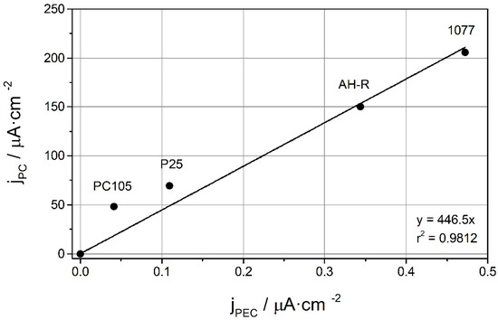 As observed, there is a reasonably good linear correlation between and , which could be used to predict the behavior in one phase given the same in the other phase. It should be noted that the correlation is valid for this particular reaction and set of photocatalysts, and by no means can it be extended to any gas phase reaction. In any case, this correlation points out that the nature of the media (gas or liquid) where the photocatalytic degradation of acetone takes place is not significantly relevant; this could be explained in terms of the acetone interaction with the titania surface, that is governing the reaction mechanism [40,44]. Interestingly, the activity ordering of the photocatalysts seems to be reversed with respect to prior measurements, as sub-micro sized powders (1077 and AH-R) now apparently appear more active than the nanosized powders (PC105 and P25); however, we should note this is only stemming from the definition of current densities, as we have expressed them in terms of the surface area, thus catalysts with larger values, will yield lower apparent current densities. Interestingly, the linear relationship between (apparent) current densities could be expressed as