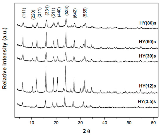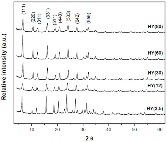 The SEM micrographs of the HY zeolites are presented in Figure A1 (Appendix A). In all cases, the images showed particles with rough and porous surfaces, as well as polygonal, faceted and irregular morphologies, of hexagonal, pyramidal tetrahedral and elongated parallelepipeds type, which are characteristic of the zeolite with faujasite structure [19,26,27]. However, there was not an effect of the SiO2/Al2O3 molar ratio on the morphology and particle size.