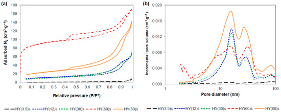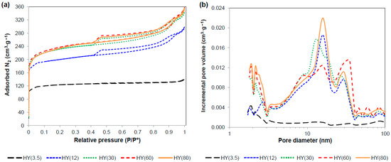 Figure 2a shows the N2 adsorption–desorption isotherms of the HY zeolites with different SiO2/Al2O3 ratios. The HY(3.5) zeolite exhibited an adsorption isotherm type I, characteristic of microporous materials, while the rest of the zeolite samples presented isotherms type IV, related to mesoporous solids. The samples showed hysteresis loops of type H4 with steep declines at the desorption isotherms, characteristic of aggregates or agglomerates of particles forming slit-shaped pores (plates or particles with edges such as cubes) with uniform size and shape [24,25].