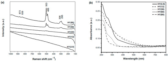 Figure 3a shows the Raman spectra of the HY zeolites. The samples with high aluminum content, HY(3.5) and HY(12), showed spectra with no noticeable bands, while the spectrum of the sample HY(30) presented very weak bands at 503 cm−1 and 486 cm−1. For the samples with SiO2/Al2O3 molar ratios of 60 and 80, these two bands were intense, and additional bands at 873 cm−1, 839 cm−1, 306 cm−1 and 295 cm−1 were observed. A similar behavior was observed by Dutta et al. [28] for a series of Y zeolites with variable Si/Al ratio and a siliceous faujasite. The bands at 873 cm−1 and 839 cm−1 correspond to the displacement of silicon atoms from the cavity formed with the four bonded oxygen atoms as well as the stretch vibrations of the Si-O bonds [29,30]. On the other hand, the prominent bands between 300 cm−1 and 600 cm−1 are sensitive to the type of rings present at the zeolite structure. In the case of zeolites with even rings (4, 6, 8, 10 or 12 members), such as the faujasite-type structure, the most intense bands are shown around 500 cm−1. Specifically, Y zeolites with high silicon contents show the appearance of a band at approximately 490 cm−1, which, besides the band at 500 cm−1, are related to the bond angles of 141° and 147° formed by the Si-O-Si bonds, involving the mixed vibration of stretching and bending of the oxygen atom [28,31,32,33]. The torsional modes of low frequency and the cation-oxygen modes are related to the bands between 200 cm−1 and 400 cm−1 [28].