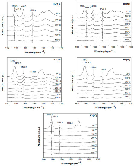 FTIR-Py spectra of the HY zeolites at different temperatures.