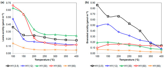 Figure 5a,b present the respective quantification of LAS and BAS of the HY zeolites at different temperatures obtained by the integrated areas of the bands at 1452–1454 cm−1 and 1538–1542 cm−1, respectively. Both types of acid sites were present in high concentrations at low temperatures, while the increase in the desorption temperature from 100 °C to 250 °C resulted in a considerable decrease in the Lewis acidity, maintaining its concentration almost constant up to 400 °C. The Brønsted acidity diminished gradually with the increase in temperature from 100 °C to 400 °C. On the other hand, a decrease in the total amount of acid sites was observed with the increase in the SiO2/Al2O3 molar ratio of the zeolites from 3.5 to 80. However, the trends for both types of acid sites were not directly related to their composition. As seen in Figure 5a, the sample HY(30) possessed more Lewis acidity than the rest of the samples at any temperature. The zeolites HY(3.5) and HY(12) presented higher amounts of BAS than the rest of the solids, (Figure 5b), and the HY(80) zeolite exhibited similar proportions of both types of acid sites.
