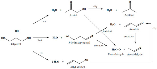 From these findings, it is proposed that the glycerol dehydration reaction over HY zeolites occurred according to the reaction scheme depicted in Figure 7. Initially, the removal of a first water molecule from glycerol proceeds through two possible reaction pathways: the removal of a primary hydroxyl moiety preferably over LAS to produce acetol, or the elimination of the secondary hydroxyl group catalyzed by the BAS at the catalyst surface, producing 3-hydroxypropanal (3-HP) [12,48]. Then, 3-HP dehydrates, yielding acrolein, or may be fragmented to produce acetaldehyde and formaldehyde, either over BAS or LAS. Both 3-HP reactions are thermodynamically favored with temperature increasing from 250 °C [43]. Subsequent cracking of dehydration products, acetol and/or acrolein, may occur over acid sites enhancing the acetaldehyde formation. On the other hand, acetol may be hydrogenated to acetone [16], which is in agreement with the low quantities of acetol observed with the HY zeolites of this study. Alternately, allyl alcohol was directly produced from glycerol, presumably through dehydration and hydrogen transfer reactions at the expense of a hydrogen donor [49,50], possibly undergoing subsequent dehydrogenation to produce acrolein [16].