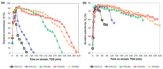A stability test for each catalyst was performed at 325 °C and GHSV = 7910 h−1 until total deactivation (glycerol conversion~1%). As shown in Figure 8a,b, the activity of the zeolites in the glycerol dehydration exhibited differences with time on stream (TOS). At the beginning of the process, the catalysts presented an induction period in which glycerol conversion gradually increases, reaching the maximum conversions at 20, 25, 35, 45 and 45 min in the order HY(3.5), HY(12), HY(30), HY(60) and HY(80), and maximum acrolein selectivities at 20, 20, 35, 45 and 45 min in the same order.