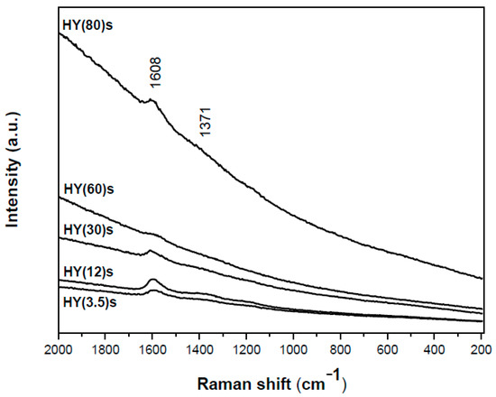 The Raman spectra of the spent zeolites are shown in Figure 12. The samples presented a main band at 1608 cm−1, which is characteristic of aromatic compounds [59,60,61], and a very weak band at 1371 cm−1 related to C3 hydrocarbon species adsorbed on the catalyst [59]. This suggested that the carbonaceous compounds deposited on the HY zeolites may be produced by the condensation–polymerization of acrolein rather than glycerol, since its polymerization results in the production of polyglycols [58].