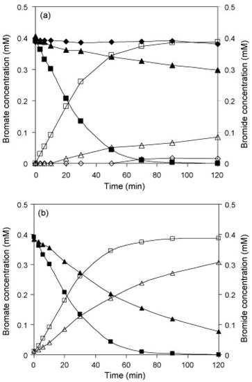 Biological removal of bromate was described by Hijen et al. [52] using denitrification bacteria in anaerobic conditions or by Ginkel and collaborators [29] with a mix of microorganisms that use bromate as electron acceptors. Nevertheless, all these biological treatments require long time periods to be effective.