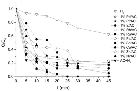 Dimensionless concentration of bromate during catalytic reduction experiments using hydrogen in the presence of monometallic catalysts supported on activated carbon (AC). Reprinted from [64], Copyright (2015), with permission from Elsevier.