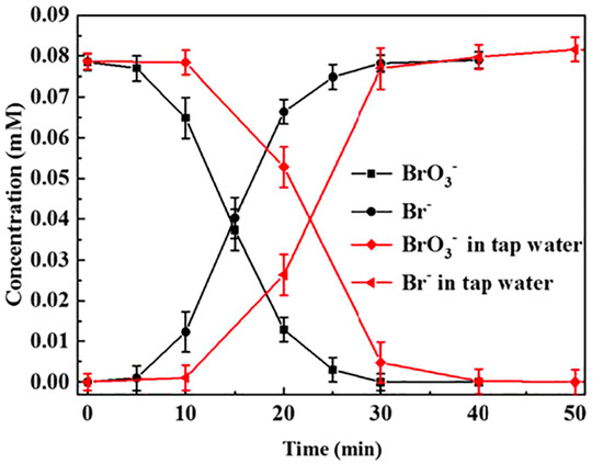 The bromate/bromide concentration changes in treated tap water and distilled water with initial bromate concentration of 0.078 mM over CoS2 hollow spheres catalyst. Reprinted from [71], Copyright (2020), with permission from Elsevier.
