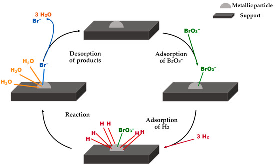 Many authors described the reaction mechanism as a dissociative adsorption of hydrogen on the surface of the metallic nanoparticles and the following reduction of neighboring adsorbed bromate anions by the dissociated hydrogen atoms [9,61,64]. Moreover, it seems that hydrogen plays a role not only on the reduction of the bromate, but also on the reduction of the metal. The continuous reduction of the metal is necessary to avoid the formation of metal-oxo species that can be generated by oxygen atoms transferred from the bromate. Therefore, hydrogen plays a dual essential role, reducing the bromates of the media and preventing the oxidation of the active metal specie [9].