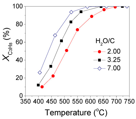 The effect of Steam/C ratio on catalytic performance was investigated for the propane steam reforming reaction over Rh/TiO2 catalyst using a GHSV equal to 55,900 h−1. The H2O/C ratio was varied between 2 and 7 by varying the concentration of both C3H8 and H2O in the gas stream in the range of 2.1–6.1% and 37–44%, respectively. Results obtained are presented in Figure 2, where propane conversion (XC3H8) is plotted as a function of reaction temperature. It is observed that increasing the molar ratio of H2O/C in the gas stream from 2 to 7 results in a progressive shift of propane conversion curve toward lower temperatures (by ≈70 °C).