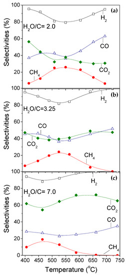 Effect of H2O/C ratio on the selectivities toward reaction products obtained as a function of reaction temperature over 0.5%Rh/TiO2 catalyst. (a) H2O/C = 2; (b) H2O/C = 3.25; (c) H2O/C = 7. Experimental conditions: the same as in Figure 2.