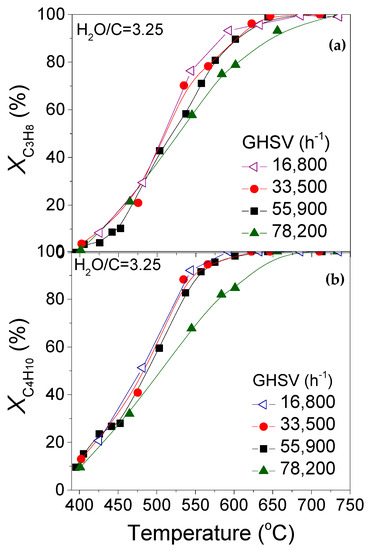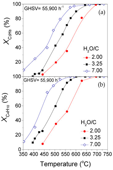 The high endothermicity of both propane and butane steam reforming reactions (Equations (1)–(4)) requires high temperatures (>700 °C) in order to achieve high H2 yields.