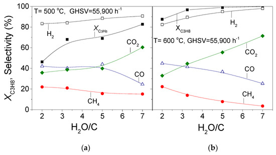 The increase of steam/C ratio in the feed results in the following differences in product distribution: (a) hydrogen selectivity at a given temperature increases with increasing steam concentration, whereas its decrease at low temperatures is lower as the steam/C ratio becomes higher, which is accompanied by lower methane selectivities. This implies that CO/CO2 methanation reactions are suppressed with increasing H2O concentration in the gas stream; (b) Sco progressively decreases followed by an increase of SCO2, which is more pronounced at higher temperatures. This can be attributed to an enhancement of the WGS, CH4, and C3H8 steam-reforming reactions, which are well known to be thermodynamically favored over H2O-rich gas streams [30,32,33].