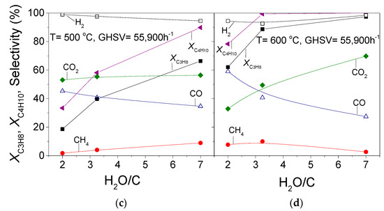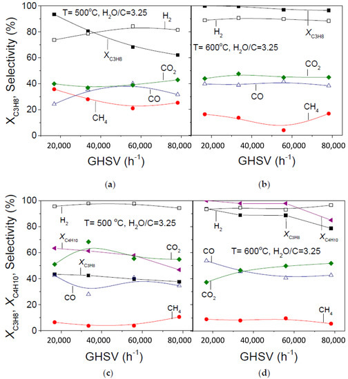 On the other hand, under conditions of propane/butane steam reforming, variations of reactants conversions and product selectivities with GHSV are less important at both temperatures investigated (Figure 8c,d). It should be noted that the effect of GHSV on catalytic performance is generally weaker than that of H2O/C ratio both in the presence and in the absence of butane in the gas stream at least under the present experimental conditions.