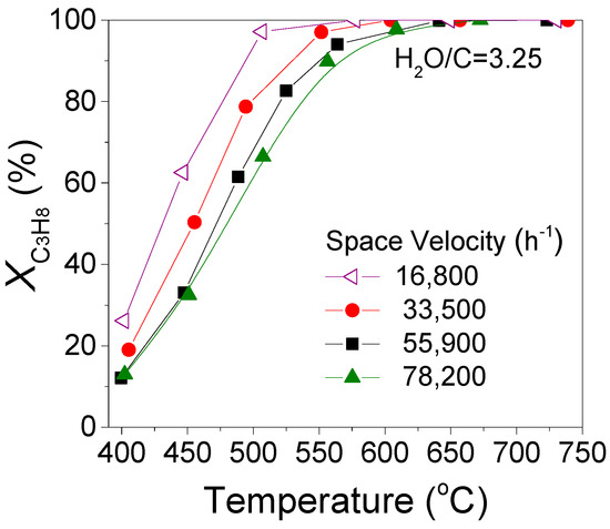 Results presented in Figure 2 and Figure 4 were obtained with a relatively high GHSV of ca 55,900 h−1. In order to investigate the effect of GHSV on the catalytic performance for propane steam reforming reaction, experiments were conducted by varying this parameter in the range of 16,800–78,200 h−1 over 0.5%Rh/TiO2 catalyst using a steam/C ratio equal to 3.25. The results obtained are shown in Figure 6, where it is observed that the conversion curve of C3H8 is progressively shifted toward lower temperatures (by ≈65 °C) with decreasing GHSV. This is due to the higher residence time achieved by decreasing the space velocity, which subsequently leads to higher propane conversion [38,39]. Interestingly, for GHSV = 16,800 h−1, the 0.5%Rh/TiO2 catalyst is able to achieve complete propane conversion at temperatures as low as 570 °C.