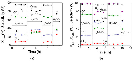 The dynamic response of Rh/TiO2 catalyst was investigated with respect to variations of H2O/C ratio at 550 °C under conditions of C3H8 steam reforming and using a GHSV = 55,900 h−1. Results (Figure 9a) showed that neither catalytic activity nor product selectivity is varied with abrupt and successive changes of H2O/C ratio between 2 and 7. In particular, switching the H2O/C ratio from 7 to 2 results in a decrease of XC3H8, SH2, and SCO2 as well as in an increase of SCO and SCH4, as it was expected according to results discussed above (Figure 2). Catalytic activity and product selectivity are completely restored to the initial corresponding levels following the subsequent switching of H2O/C to 7 and then to 2.