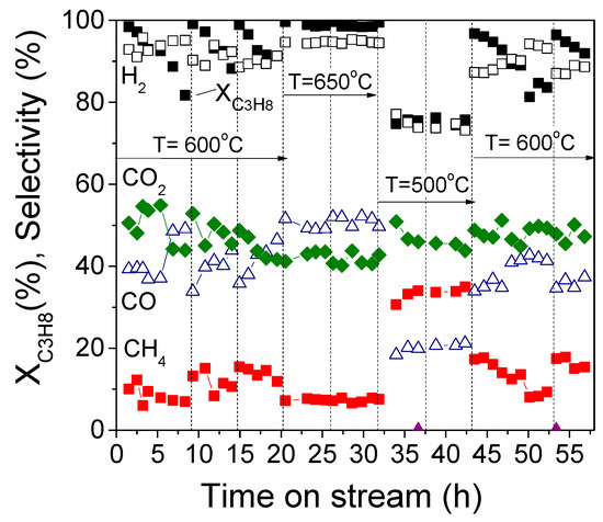 As discussed above, the origin of carbon formation may be due to the decomposition of C2H6, C2H4, CH4, and/or CO (Equations (10)–(13)). However, taking into account that no ethylene or ethane is produced under the present reaction conditions, carbon deposition due to the decomposition of those species can be excluded. This is also the case for the “Boudouard” reaction (Equation (13)), as evidenced by the increase of SCO and the decrease of SCO2 with time-on-stream at 600 °C, which accompany the progressive decrease of XC3H8. Moreover, the latter reaction is thermodynamically favored at significantly lower temperatures (<400 °C). Therefore, CH4 decomposition (Equation (13)) is the main contributor to carbon species, which is also supported by the progressive decrease of SCH4 followed by the increase of SH2 [48,49,50,51].