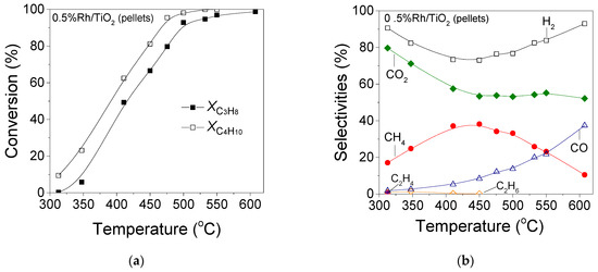 Catalytic performance of 0.5%Rh/TiO2 catalyst in the form of pellets for the propane/butane steam-reforming reaction under realistic reaction conditions. (a) Conversions of C3H8 and C4H10; (b) Selectivities toward reaction products. Experimental conditions: H2O/C = 3.25; GHSV= 9000 h−1; Feed composition: 4.27% C3H8, 0.23% C4H10, 0.15% Ar, 44% H2O.