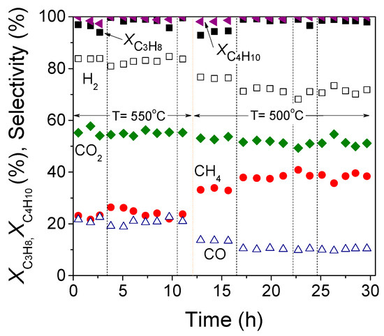 The long-term stability of 0.5%Rh/TiO2 pellets was investigated at 550 and 500 °C using the same experimental conditions with those used in Figure 12. It was found that 0.5%Rh/TiO2 exhibits excellent stability at 550 °C for about 12 h-on-stream, with the conversions of propane and butane being about 98% and 99%, respectively (Figure 13). Product selectivity also remained stable, taking values of SH2 = 83–84%, SCH4 = 23–24%, SCO2 = 53–55%, and SCO = 19–21%. A decrease of temperature at 500 °C results in a decrease of XC3H8 and XC4H10 to 93 and 98%, respectively. Interestingly, both conversions are gradually increased with time-on-stream, reaching the values of 98% (for C3H8) and 100% (for C4H10), which remain constant for about 18 h-on-stream.