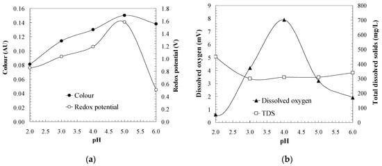 To analyse this result in more detail, Figure 3a represents the colour of the treated water once it has reached a steady state, together with the redox potential values. It is observed that both variables show a similar evolution regarding pH effect. By increasing the value from pH = 2.0 to 5.0, the intensity of the colour and the redox potential increases, showing a maximum when carrying out the tests at pH = 5.0. As this pH increases, the colour and redox potential of the water decrease.