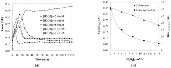 (a) Effect of hydrogen peroxide on colour changes in a photo-Fenton system during the carbamazepine oxidation. (b) Maximum colour formation (Colourmax, AU) and time corresponding to the maximum colour formation (Timecolour max, min) as a function of the oxidant dosage. Experimental conditions: [CBZ]0 = 50.0 mg/L; pH = 3.0; [Fe]0 = 10.0 mg/L; [UV] = 150 W; T = 40 °C