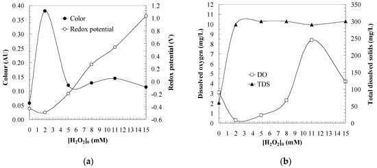 The dissolved oxygen analysed in treated samples is consistent with their redox potential values. It is observed that the DO concentration in water increases as the treatment is conducted with higher concentrations of oxidant, up to a maximum operating point, which corresponds to [H2O2]0 = 11.0 mM, with a DO = 8.4 mg O2/L. However, in the test carried out using [H2O2]0 = 15.0 mM, the DO experienced a big decrease until values of DO = 4.2 mg O2/L. These lower levels of DO are observed throughout the course of the reaction, which could be due to operating with excess of oxidant with respect to the iron concentration. On the other hand, the concentration of Total Dissolved Solids (TDS, mg/L) remains constant in all the tests performed.