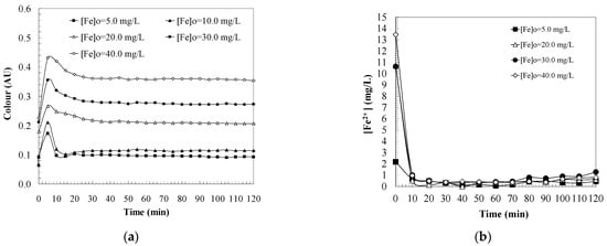 Figure 7 and Figure 8 show the effect of catalyst concentration on the colour acquired by oxidised carbamazepine solutions. Operating with different iron concentrations (Figure 7a), it is observed that adding the iron dose established for each experiment increases tint to the initial carbamazepine solution (Colour0, AU). The colour that the water gains shows a second degree polynomial increase (Equation (3)) with respect to the concentration of total iron supplied ([Fe]0, mg/L). The initial iron added to the solution in the form of ferrous sulfate undergoes a series of equilibrium reactions between species, because the pH of the sample is adjusted to pH = 3.0 (Figure 7b). For this reason, one part of the iron ions is in a reduced state and the other is oxidised, being the ferric ions the providers of the tint to the water.