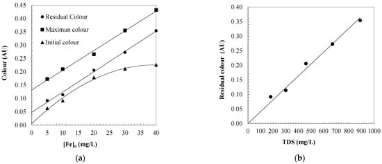 (a) Effect of iron dosage on water colour levels observed during the carbamazepine oxidation. (b) Relation-ship between total dissolved solids and the residual colour of water oxidized. Experimental conditions: [CBZ]0 = 50.0 mg/L; pH = 3.0; [H2O2]0 = 15.0 mM; [UV] = 150 W; T = 40 °C.
