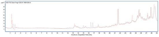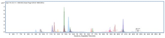 A screening method was developed, allowing the elution and ionisation of the majority of compounds in the sample. Before starting the analysis, the stabilisation of the system, the reproduction in the signals, and the correction of the exact masses were checked. With the aforementioned conditions, the chronogram shown in Figure 9 was attained.