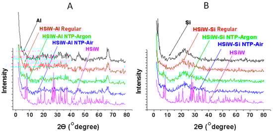 XRD patterns of Al-supported and Si-supported catalysts are presented in Figure 1A,B, respectively, together with those of the respective blank support and HSiW powder. Evidently, the HSiW was well dispersed on both Al and Si. Usually, a material with a mesoporous structure would show a large peak in the low angle region (0°–2°) of the XRD patterns [,,]. Although our XRD scan could only start from 2° due to the instrument limitation, there would be a steep decline line around 2°, if there was a large peak in the low angle region. This decline for a NTP fabricated catalyst was steeper than that for the regular counterpart. Further, the decline for a NTP-argon fabricated catalyst was steeper than that for the NTP-air fabricated counterpart. This could indicate that there was a more distinct mesoporous structure occurring after NTP exposure, or that the mesoporous structure of a support was better retained after the loading of HSiW if NTP was applied during the fabrication. This tendency was more obvious for Si-supported catalysts, which can be explained by assuming that the electron bombardment etched the surface of the catalyst, opening up some micropores, and converting them into mesopores. Since the Si has narrower pores, the existence of the NTP field facilitated the diffusion of the HSiW molecules into the pores instead of clustering at the pore entrances. The results implied that, after NTP exposure, the mesoporous structure was preserved to a large degree while reducing the loss of surface area due to the loading of HSiW.