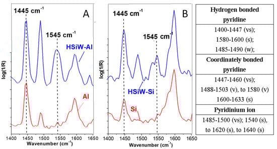 Py-FTIR spectra of (A) Al and HSiW-Al (regular 30 wt.% acid loading), and (B) Si and HSiW-Si (regular 20 wt.% acid loading). The responsive peak information is summarized in the imbedded table (vs: very strong; s: strong; v: variable; w: weak) [].
