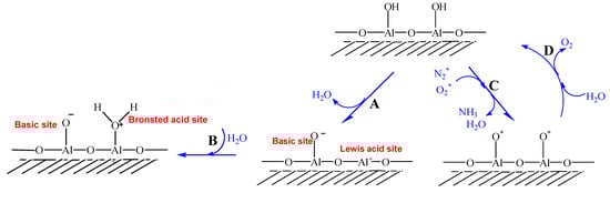 - Kameoka, S.; Kuroda, M.; Aoyagi, K.; Ito, S.; Kunimori, K. Formation of novel Al2O3 surface (Al-O-star) by plasma-excited nitrogen and its catalytic application—Production of ammonia and oxygen from nitrogen and water. Appl. Surf. Sci. 1997, 121, 351–354. [Google Scholar] [CrossRef]
