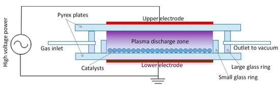 A plate-to-plate configuration was utilized in this dielectric barrier discharge (DBD) device. As illustrated in Figure 6, two Pyrex glass plates (102 × 102 × 1.6 mm) were separated by a thin-sliced glass tube (large glass ring, 89 mm OD, 1 mm wall thickness, and 10 mm height), which set the gap for NTP discharge. A round copper tape (64 mm in diameter) was fixed on the outside surface of each plate in the center to serve as two electrodes. The round shape was used to prevent possible spark generation at a sharp edge of the electrodes (such as right angles if a square electrode was used). The discharge zone was therefore a cylinder with a dimension of 64 mm in diameter and 10 mm in height. Two glass tubes (5 mm ID, 6 mm OD) were fixed on opposite sides of the large glass ring; one was connected to a gas tank (gas inlet), and the other was connected to a 150 Torr vacuum supply (gas outlet). Another thin-sliced glass tube (small glass ring, 64 mm ID, 1 mm wall thickness, and 7 mm height) was placed inside the discharge zone to keep the catalyst particles within the NTP discharge. The discharge zone was sealed. The flow rate of a gas supply at 20 mL/min was controlled via a rotameter. The two types of discharge gas used in this study were argon (industrial grade, 99.99%) and air (breathing grade). The NTP field strength used in this study was 9 kV/cm at 1 kHz of frequency.