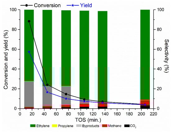 Comparing the behavior of different catalytic systems reported in the literature is not entirely easy due to the use of often very different conditions. However, we tried to summarize the available data from the literature (Table 1). Chloride-based catalysts are very frequently studied in ethane ODH at temperatures higher than 500 °C, mostly 650 °C, and even higher [14,15,17,21,38]. The reported ethene yields for these works vary in a wide range from around 2 to 74%. Different alkali metals were exploited so far, for instance, Li [14,15,21,22,25,38], Na [13,25,26], K [13,16,25,26], Ba [17], Sr [13]. These alkali chlorides have been used on various supports including silica, zirconia, Dy2O3, MgO, and other metal oxides. In general, different forms of zirconia as support exhibited higher activity and yields than the other supports. In all cases, the addition of chlorides resulted in higher activity and selectivity compared to pristine support. A similar catalyst as the one in this research was studied in Ayari’s work, reporting 27% yield compared to 66% reported here for 15 min of TOS at the same temperature, although the time on stream for the measurements in Ayari’s work is not mentioned. There are several reports on measuring at diverse longer TOS and higher temperatures [13,14,16,22,25], which have been compared with similar TOS in this research.