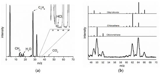 (a) Mass spectrum of the product of ethane oxidative dehydrogenation (ODH) over S-ACl, full-spectrum, and (b) details of low-intensity signals at m/z 45–70. At the bottom is displayed the experimental mass spectrum, above that are the model spectra of the three most probable chlorinated compounds formed during the reaction.