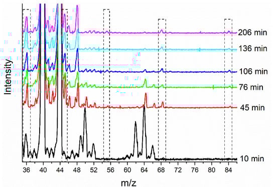 With increasing time on stream, the conversion of ethane decreased as well as the amount of side products. In addition, the nature of the side products changes, as can be seen in the changes of mass spectra character (Figure 3). Intensity of the main fragments of the chlorinated hydrocarbons disappeared during the first hour, and new signals at m/z = 45, 46, 47, 48, 68, and 84 were detected. These new by-products were comprised of some higher hydrocarbons (C5) or oxygenates. The most possible compounds based on comparison with the reference mass spectra are allyl vinyl ether; 1,3-dimethylallene; trans-2-methyl-2-butenal; 2-methyl-2-butenal; 4-pentyne-2-ol; 3-butynoic acid; 2-buten-4-olide; 1-ethyl-2-methylacetylene; and 3-methyl-2-butenal [37].