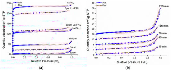 N2 adsorption–desorption isotherms of (a) the fresh and spent pristine supports, physical mixture of S-ACl, the fresh catalyst before and after reaction (time on the stream (TOS): 223 min) in ethane ODH (isotherms corresponding to the fresh catalyst shifted along the y-axis by an increment of 20 cm3/g), (b) the spent catalysts after different TOS under reaction atmosphere (isotherms are shifted along the y-axis by an increment of 4 cm3/g).