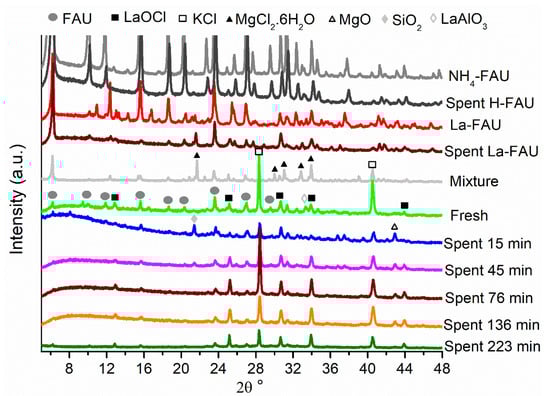 X-ray diffraction patterns of the prepared catalyst exhibited the expected phases including FAU zeolite and alkali chlorides (Figure 6). According to the obtained XRD patterns, the mechanical mixture of the catalyst consists of crystalline KCl (Sylvite, Crystallography Open Database (COD) code: 9008651, lattice planes (002), (022) at 28.4° and 40.5°), MgCl2·6H2O (Bischofite, COD: 9011352, lattice planes (111), (310), (220), (11-2), (22-1) at 21.7°, 29.9°, 31°, 32.8°, and 33.9°, respectively), FAU zeolite (Faujasite, COD: 1507214, lattice planes (111), (022), (113), (133), (115), (044), (226), (137), (337) at 6.1°, 10°, 11.8°, 15.5°, 18.5°, 20.1°, 23.6°, 27.4°, and 29.3°, respectively), and LaOCl (Lanthanum–oxychloride, tetragonal, COD: 2101549, lattice planes (001), (011), (110), (012), and (020) at 12.8°, 25.2°, 30.7°, 33.9°, and 43.9°), meaning that the catalyst contains an excess of La; thus, not all La is in the cationic sites of zeolite and part of the lanthanum form oxychloride. Unlike KCl, the MgCl2 showed a different crystalline structure (MgCl2·6H2O, Bischofite) as its original form before mixing with the support. After the heat treatment at 500 °C, a solid solution of chlorides formed on the surface of the catalyst due to the dissolving of chlorides into each other; therefore, the changes in the quantity and intensity of the diffraction patterns are expected. The fresh catalyst exhibited the presence of FAU, LaOCl, and KCl, but not any form of MgCl2 anymore. Furthermore, a new phase formed in the fresh catalyst, LaAlO3 (lanthanum aluminum trioxide, COD: 2206576, lattice plane (011) at 33.4°). In the spent catalysts, besides LaOCl and KCl, SiO2 (Cristobalite, COD: 9008233 (111) at 21.5°) is also present, whereas the presence of MgO (Periclase, COD: 9000501, lattice plane (002) at 42.9°) instead of its chloride form, showing the change in crystallinity after chlorine lost from the beginning of the reaction. It means that La-oxychloride and KCl are quite stable compounds, but MgCl2 is highly labile. The intensity of the main diffraction line of FAU zeolite in low angles is decreased with time, which could be due to lowering its crystallinity. Additionally, the spent pristine support includes H-FAU and La-FAU have not exhibited important differences compared to the fresh ones, showing they are rather stable during the reaction.
